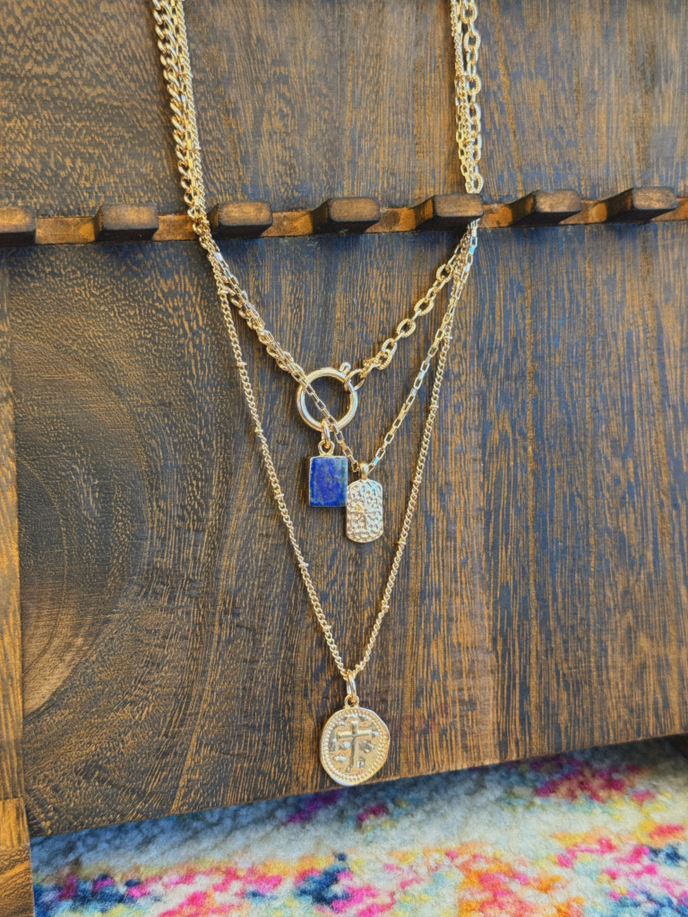 LAYER CELESTIAL CROSS BLUE STONE CHARM NECKLACE