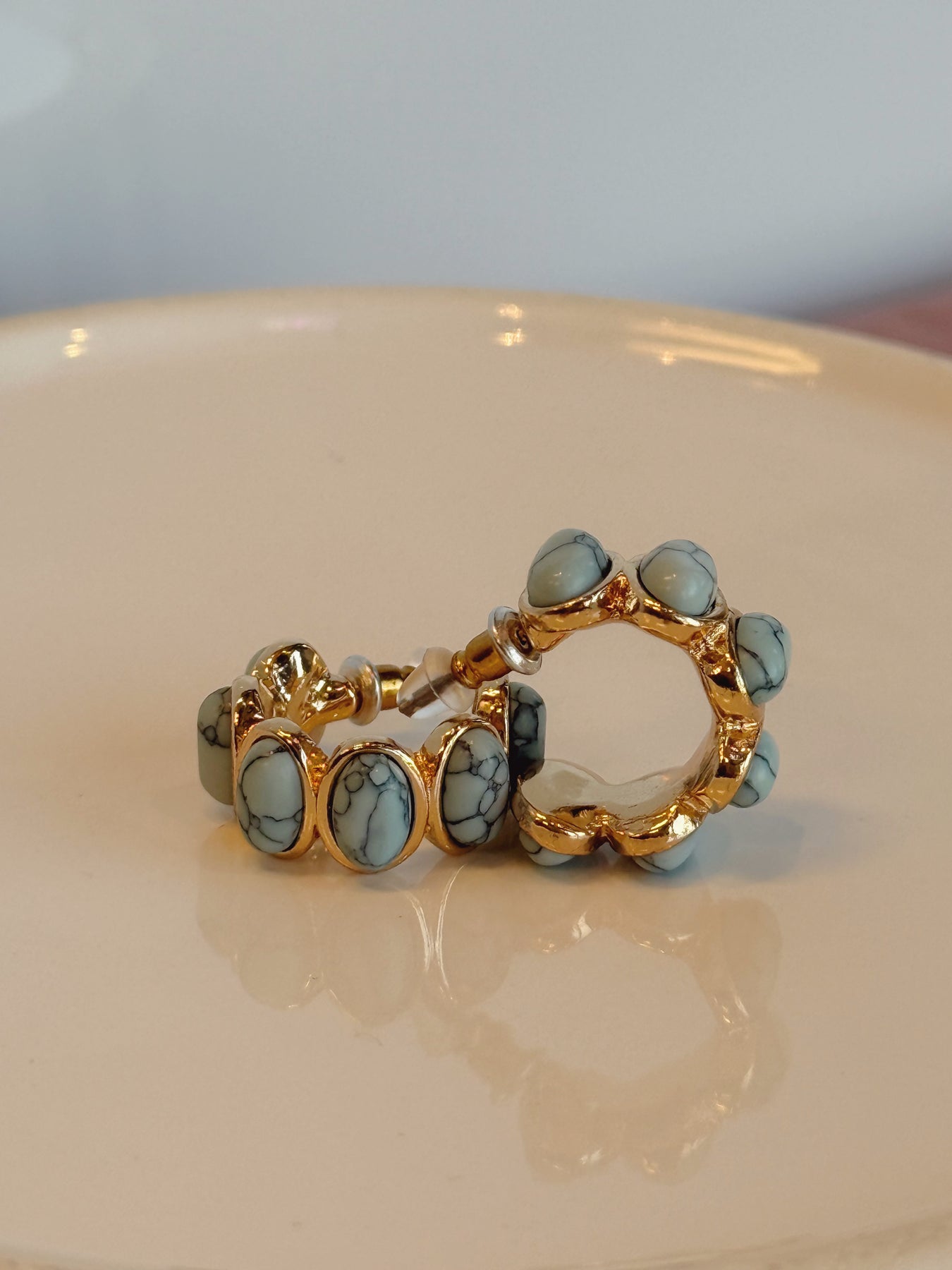 Oval Natural Stone Turquoise Hoop Earrings, featuring a striking oval turquoise stone set within a sleek hoop design, these earrings offer a bold yet refined look. The vibrant turquoise adds a pop of color, while the hoop style ensures a comfortable and secure fit. The titanium posts ensure durability and hypoallergenic wear, making them suitable for sensitive ears. Hypoallergenic post Surgical steel post Lightweight post Durable post Product details: width: .75" length: .75" earring back: Titanium Post metal finish: gold Plating product: Lead & Nickel Compliant Durability: Double E-coating