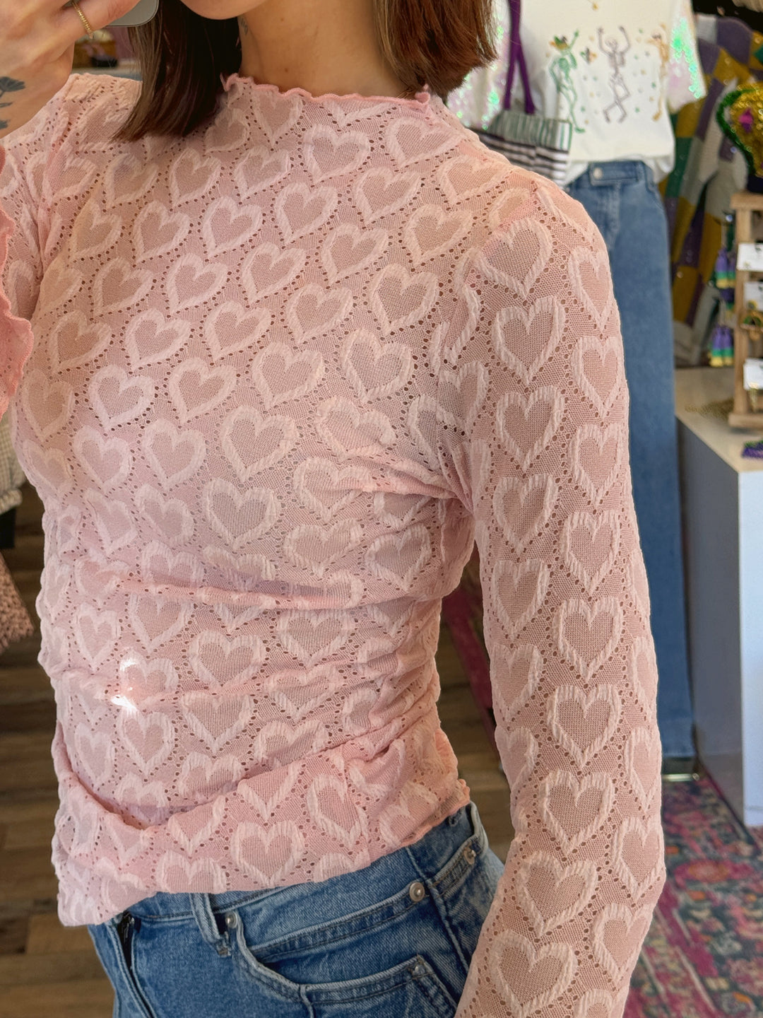 Heart Mesh Mock Neck Top