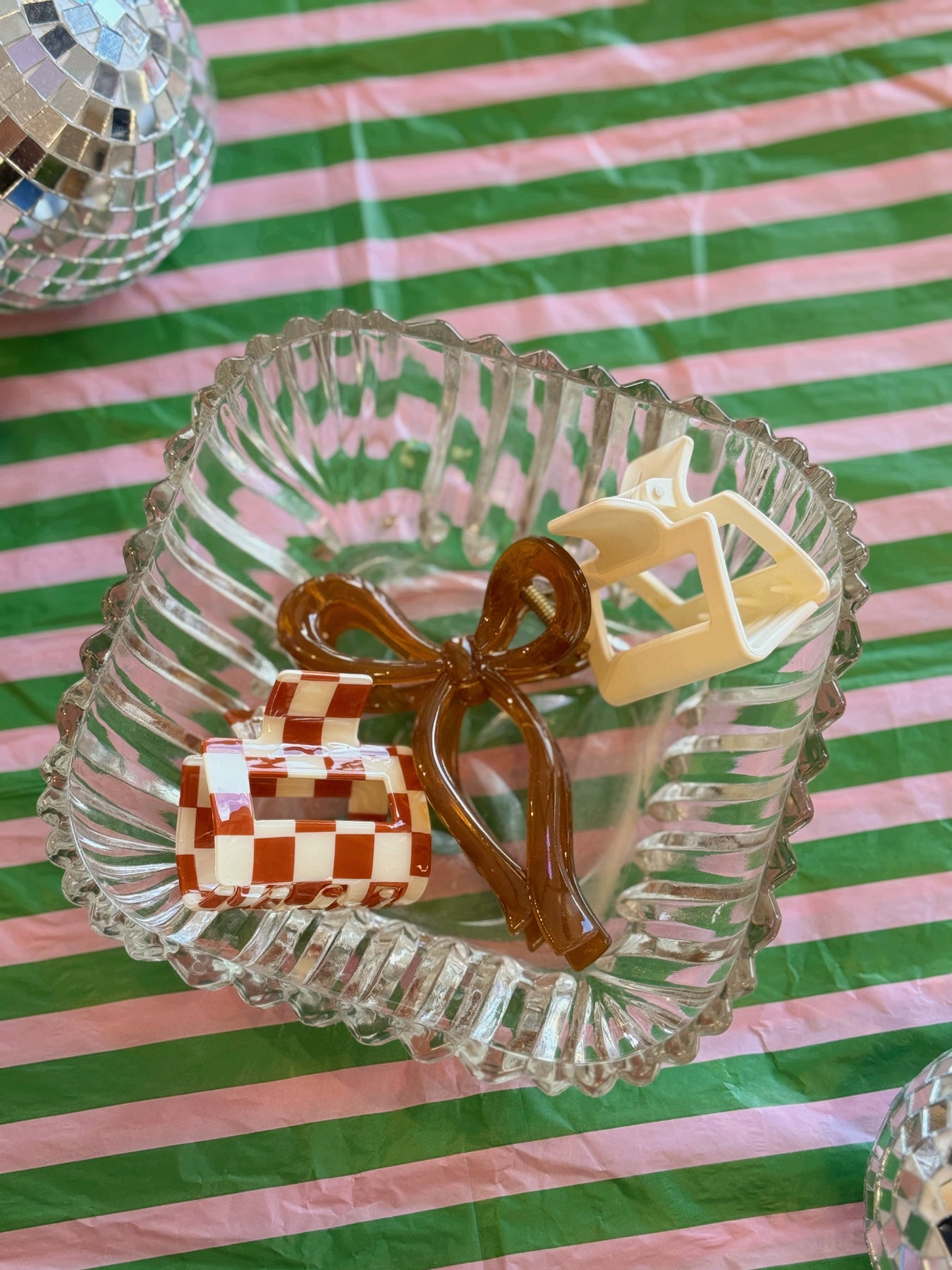 Add a touch of style and pop of color to your hair with this hair clip set. This set features a collection of beautifully crafted clips, each designed to complement a variety of hairstyles. Whether you're looking to add a subtle accent or make a bold statement, these clips are perfect for any occasion. This set of 3 includes a matte cream square slip, a mocha and cream checkered square clip, and a mocha bow clip.